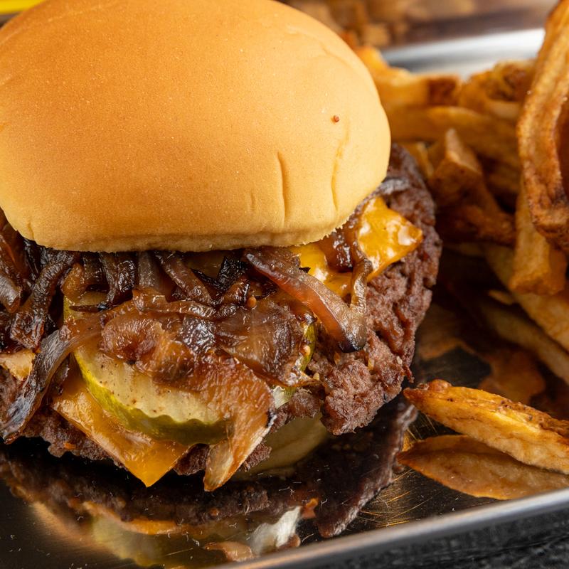 Our signature burgher SMASHED and topped with cheddar cheese, grilled onions, and grilled Pittsburgh Pickle Company pickle slices. Make it a double or a triple